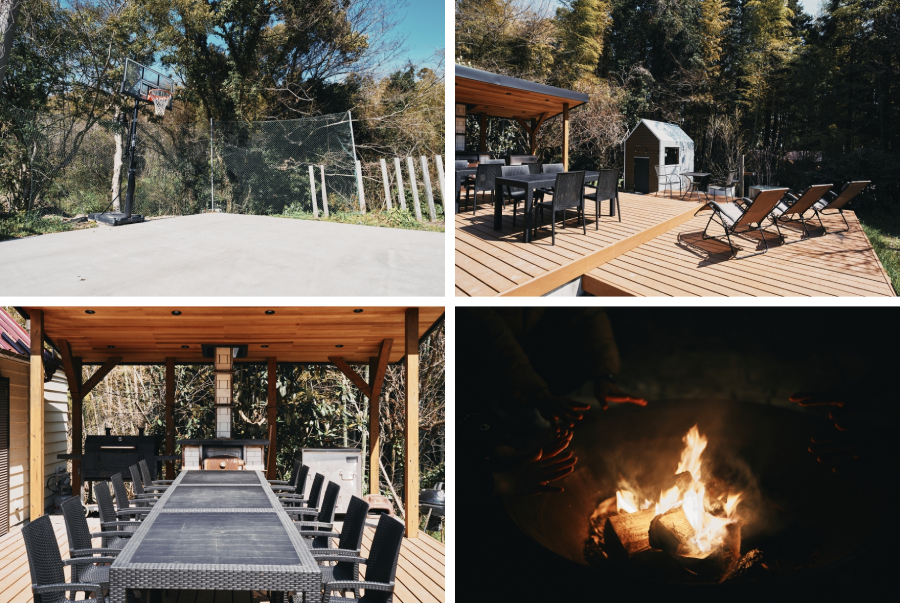 広々とした敷地内には、プールやサウナ、暖炉にBBQテラス、バスケットコート、ペットがノーリードで遊べる森の空間があり、大切な家族であるペットもストレスなく、大自然で伸び伸びと過ごすことができます。また、ペット用のさまざまなアメニティも用意されており、安心して滞在を楽しめます。