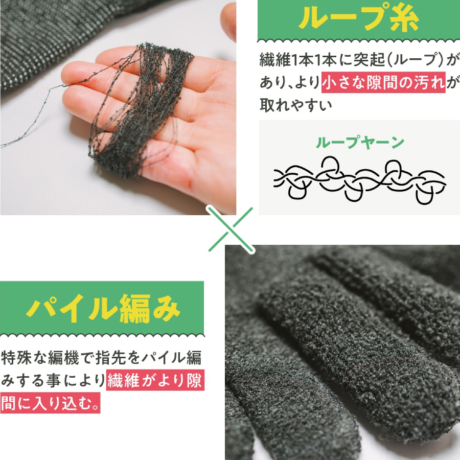 繊維1本1本に突起(ループ)があり、小さな隙間の汚れまでしっかりとキャッチします。また、親指・人差し指・中指の指先はパイル編み構造にしたことで、繊維が隙間に入り込みやすくなっています。