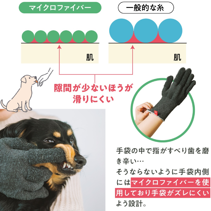 さらに、目の細かい素材を使用しているため、猫の鋭く細い歯でも貫通しにくい構造です。また、手首部分を長めに設計しているため、動物の口へ手を持って行く際の恐怖心をやわらげます。また、手から外れにくく、誤飲対策の役割も担っています。