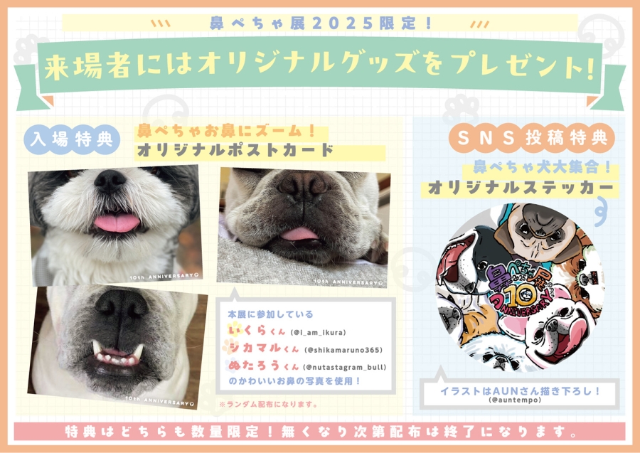 10周年記念の来場者限定特典として、10周年記念オリジナル「鼻ぺちゃ犬になれるポストカード」がプレゼントされます。顔の前にかざして撮影すれば、まるであなたも“鼻ぺちゃ犬”に大変身できる、遊び心満載のしかけです。