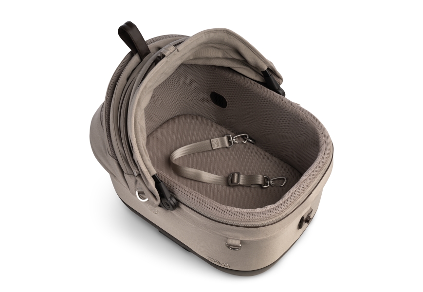 快適性への配慮もされており、キャリア外側のカラーに合わせた丈夫な生地の耐久ライナー・マットレスに加え、通気性に優れたメッシュ素材のライナー・マットレスが標準装備されています。キャリアの天井となるキャノピーは左右どちらからでも開閉できる設計で、ペットの出し入れが容易です。キャノピーにはUPF50+素材が使用されており、ペットを紫外線から守ります。また、製品全体に有害な化学物質を使用しない難燃性生地が採用されており、安心して使用できます。