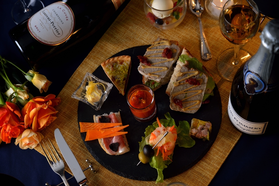 ドリンクは「ローラン・ペリエ ラ キュベ」をはじめとするスパークリングワイン3種に加え、赤ワイン、白ワイン、ソフトドリンク各種が用意されています。フードプレートには「パテ・ド・カンパーニュのオープンサンド」や「エビのエスカベッシュ」など7種のオードブル、デザートとして「ライチとパインのカクテル」が提供されます。さらに、ホテルオリジナル犬用おもちゃのプレゼントも用意されています。