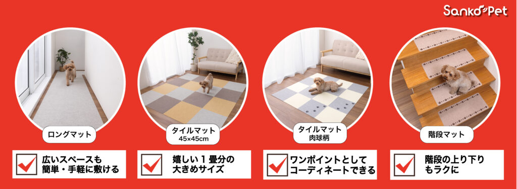 廊下や広いスペースに敷き詰められる「このコ想いのロングマット」、部屋の形に合わせて組み合わせられる「このコ想いのタイルマット」、ワンポイントで使える「このコ想いのタイルマット肉球柄」、そして階段用の「このコ想いの階段マット肉球柄」の4タイプです。