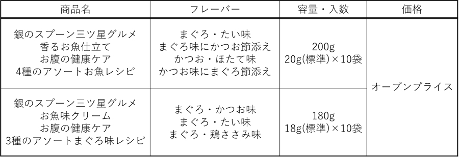 「銀のスプーン三ツ星グルメ 香るお魚仕立て」は、香ばしく焼き上げたドライ粒が特長で、カリッとした食感と豊かな香りを楽しむことができます。「銀のスプーン三ツ星グルメ お魚クリーム」は、魚味のクリームがドライ粒に絡んでおり、口のなかで香りと味わいが広がる設計です。