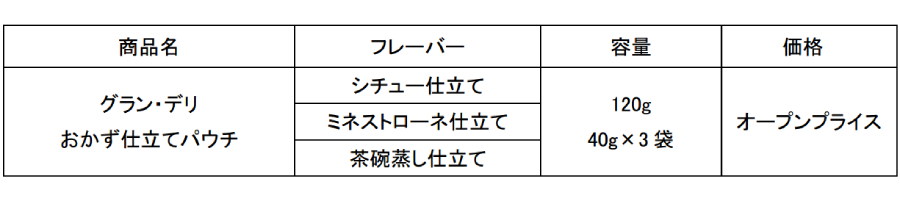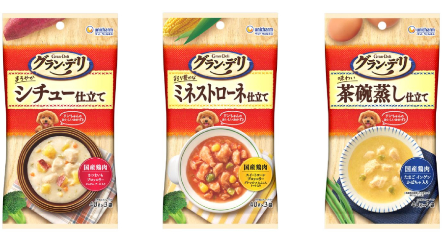 ユニ・チャームは、犬用ウェットフード「グラン・デリ おかず仕立てパウチ」から、新たに3種類のメニューを発売しました。