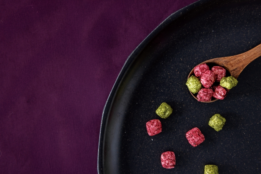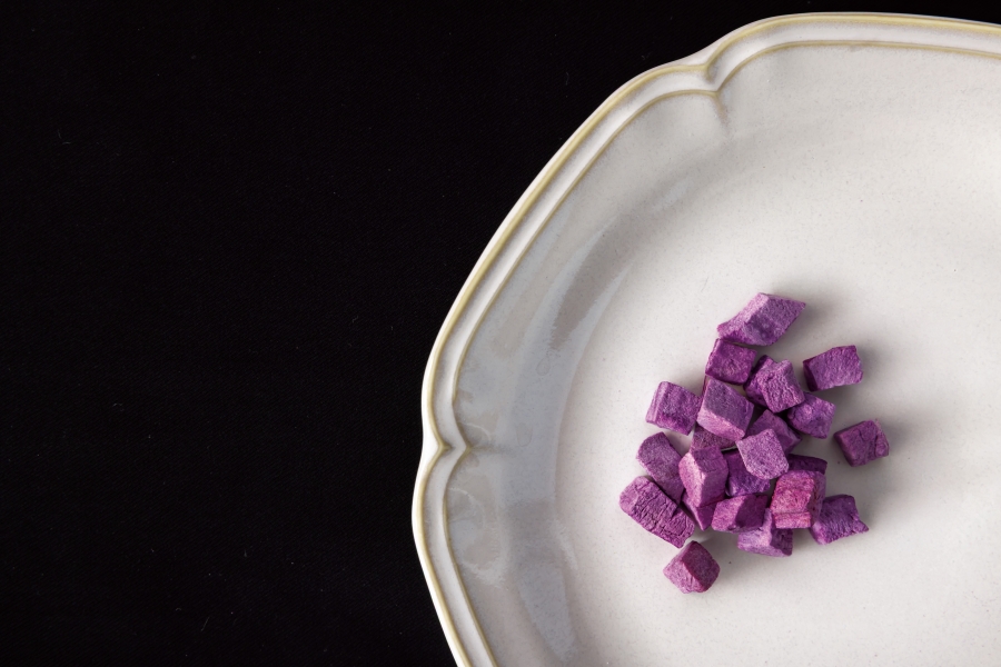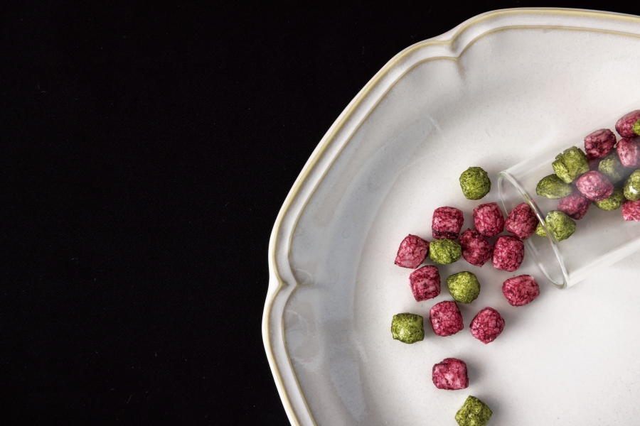 | 原材料 | 米粉、卵、てん菜糖 / 国産プロセスチーズ / ハーブ鶏 / もち米、ブルーベリー、水あめ、緑茶パウダー | むらさき芋 / もち米、ブルーベリー、水あめ、緑茶パウダー / 米粉、米ぬか、ブルーベリー、むらさき芋、片栗粉、黒ごま、黒糖、鶏レバー / 米粉、卵、てん菜糖 |