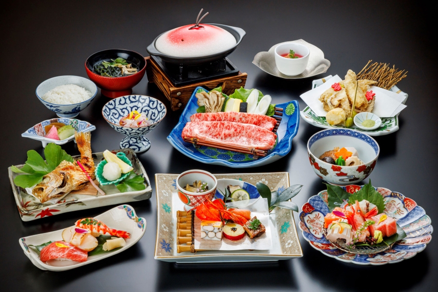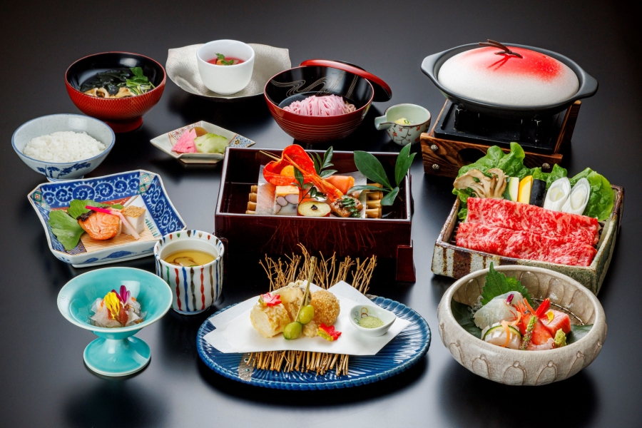 矢田屋松濤園は、大江戸温泉物語グループで唯一の会席料理を提供しています。会席料理は「秋基本会席」と「秋特選会席」の2種類が用意されており、金沢の市場で厳選された旬の食材や、加賀野菜などの地元食材「じわもん」を使用しています。料理長が腕を振るい、食感や見た目、五感で秋を感じられるように工夫された繊細な料理に仕立てられています。