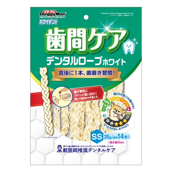ドギーマン、犬用歯みがきガム「ホワイデント 歯間ケア」 歯間ケア目的のフロスとロープ型