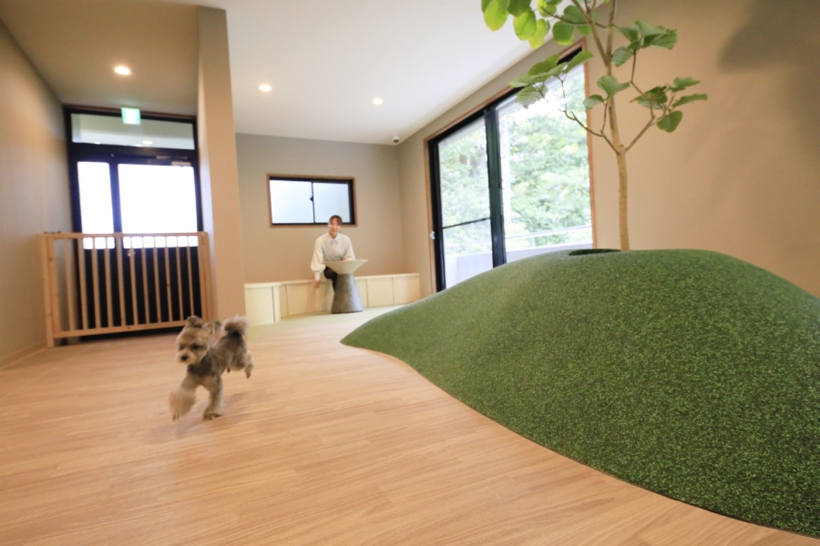 同施設は、小型犬と泊まれる温泉旅館で、屋内ドッグランや屋外コミュニティガーデン、愛犬用の衣装も揃うフォトスタジオなどを完備しています。客室は半露天風呂付きの部屋など全4タイプがあり、大浴場では大涌谷と早雲山からの混合泉が楽しめます。