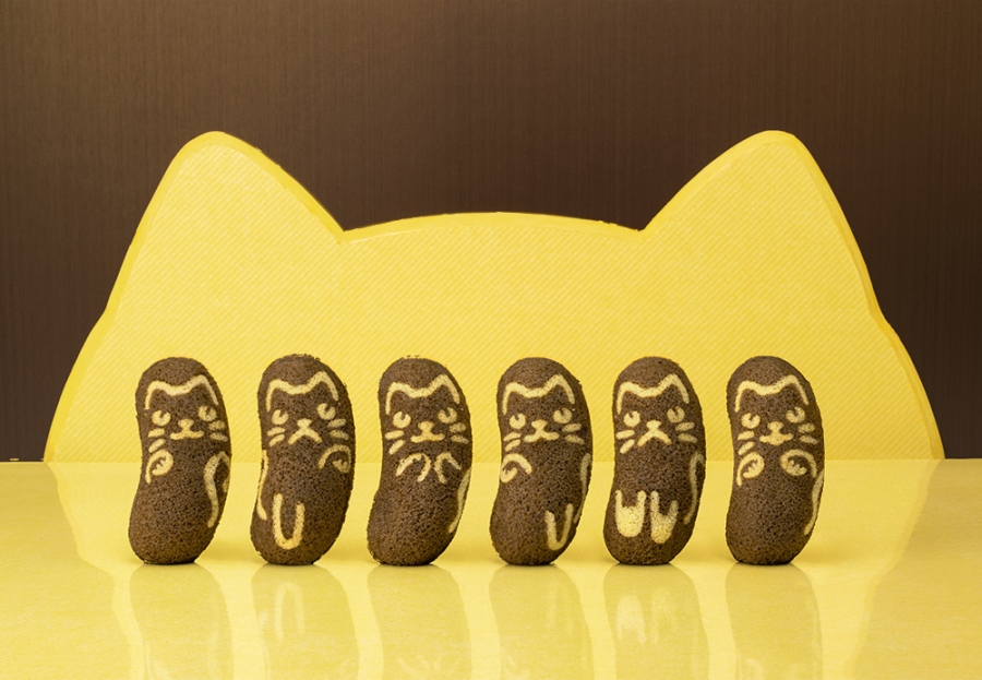 東京ばな奈ぶにゃんこ」は、ココアを混ぜ込んだ黒猫カラーのふかふかなスポンジケーキで、チョコバナナカスタード味のクリームが入っています。ケーキの絵柄は全6ポーズで、「招き猫ポーズ」や「靴下猫」などがあり、まれに「両手招き猫」の絵柄が入っていることもあります。