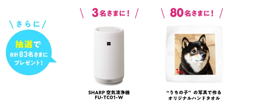 さらに、さまざまな場所に設置できるコンパクトデザインの空気清浄機や世界でひつつだけの“うちの子”の写真でつくるオリジナルハンドタオルが抽選で合計83名に当たります。