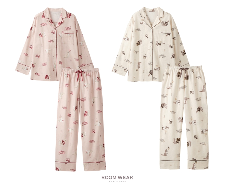表面を起毛させたコットン100%のフランネル生地を使用したパジャマも登場。「キャットフランネルシャツパジャマ」は、子猫とホリデイモチーフをプリントした開襟シャツタイプです。ワンサイズ展開で、カラーはピンクとアイボリーの2色。価格は5,980円です。