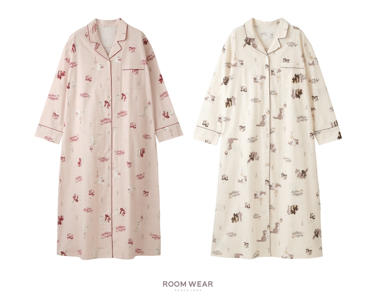 同柄の「キャットフランネルシャツワンピース」もラインナップ。体を締め付けない楽な着心地で、前のボタンを開ければローブとしても活用できます。ワンサイズ展開で、カラーはピンクとアイボリーの2色。価格は4,980円です。