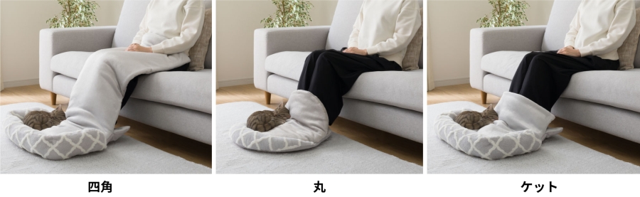 さらに、今年の新たなラインナップとして、飼い主も足を入れてペットと一緒に温まることができる「アシポカペットベッド」が登場しました。ペットのぬくもりを感じながら一緒にくつろげる新しい形のペットベッドで、四角、丸、ケットの3種類から選ぶことができます。