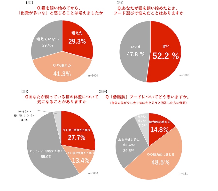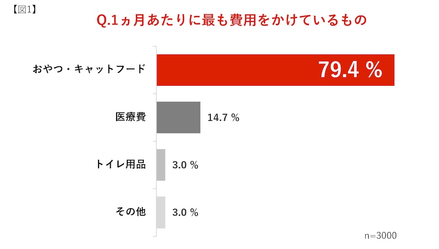 猫関連の出費については、「おやつ・キャットフード」が最も高い割合を占め、約8割の飼い主が毎月最もお金をかけている項目として回答しました。続く支出は「医療費」(予防薬、ペット保険料を含む)、「トイレ用品」の順となりました。