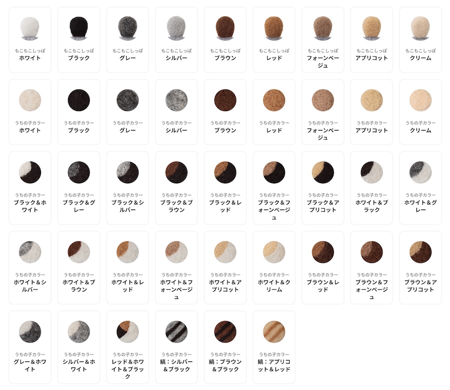 毛色や模様をイメージした「うちの子カラー」と、ふんわりまあるい「もこもこしっぽ」の2シリーズがあります。天然ウールという異素材の組み合わせにより、ぬくもりある質感が表現されています。