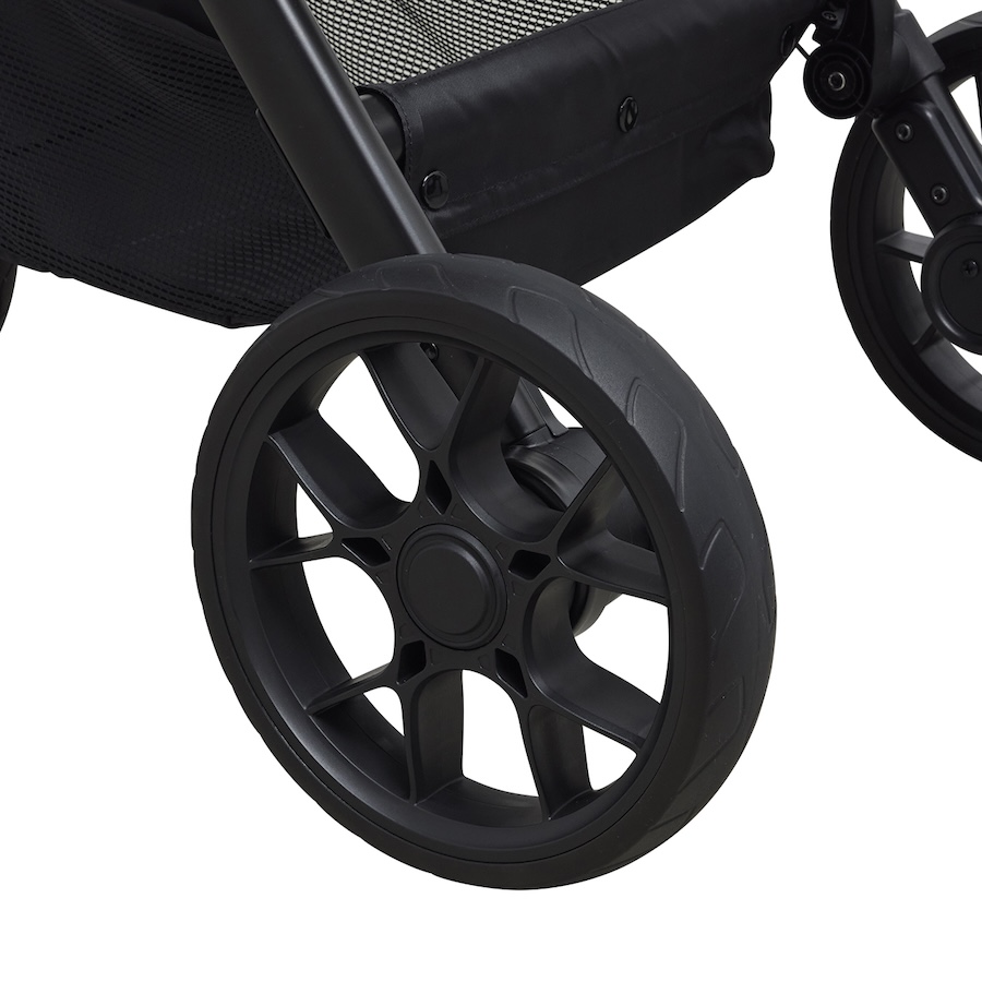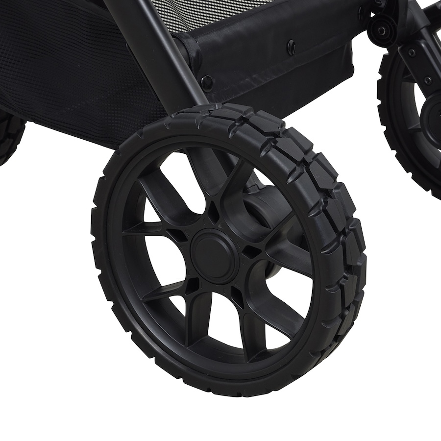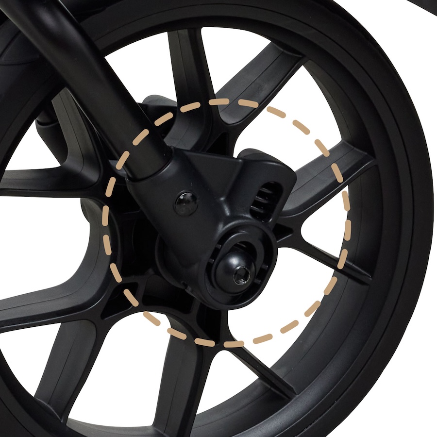 直径23cmのノーパンクタイヤを採用しており、段差や悪路にも強く、メンテナンスが不要です。前輪サスペンションを備えることで、愛犬への振動負担を軽減します。