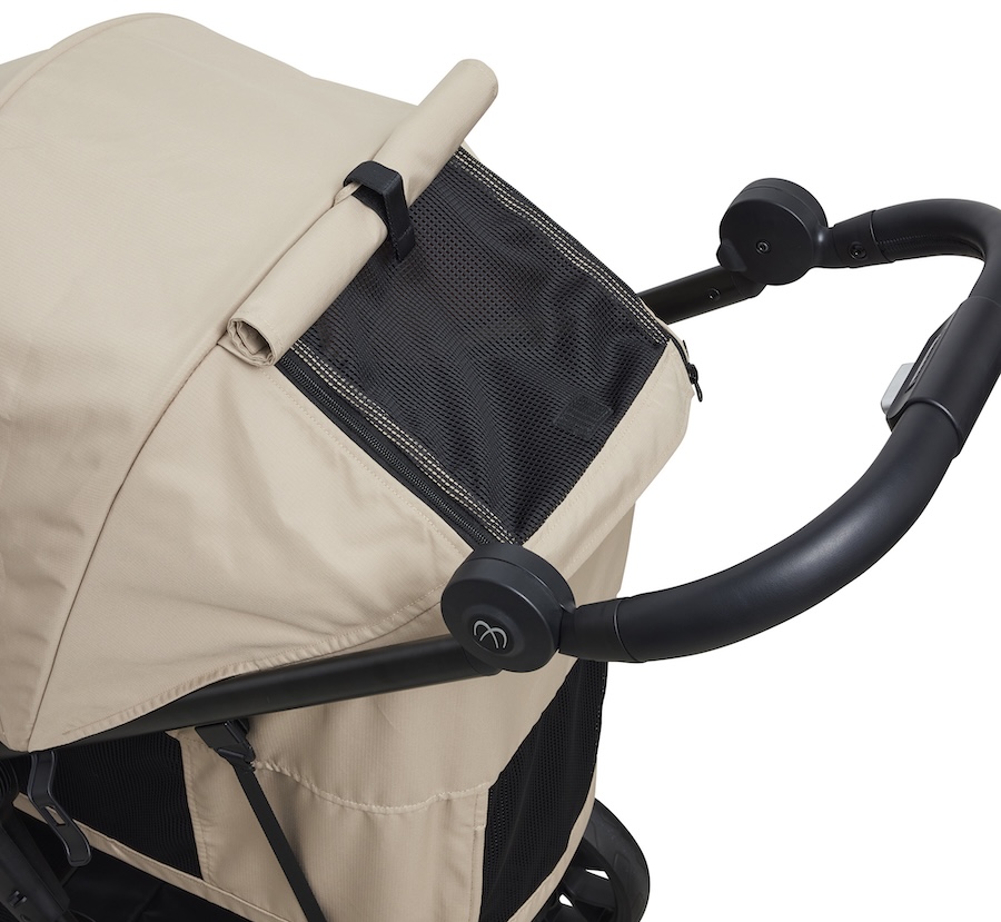ほかにも、コット内はゆったりとした広々空間を確保しており、日差しをさえぎるビッグシェードを装備しています。開閉ベルトにはマグネットを内蔵したワンタッチマグネット式ベルトが採用され、ロック部に近付けるだけで自動的に固定されます。