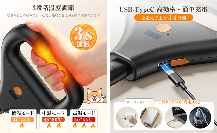 ハンドル部分に熱伝導性に優れたアルミ合金を採用した発熱設計です。3秒で急速発熱し、厳しい冬の公園散歩でも手元の暖かさを持続させます。温度は3段階(40~45℃の低温、45~50℃の中温、50~55℃の高温)で調節できます。