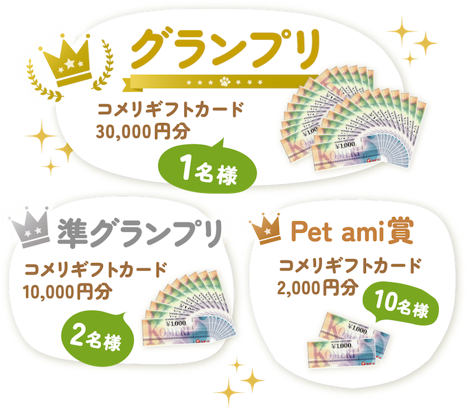 厳正な審査によりグランプリ(1名)に3万円分、準グランプリ(2名)に1万円分、Pet ami賞(10名)に2,000円分、入賞者にはコメリギフトカードが贈呈されます。審査結果は2026年5月1日に発表される予定で、賞品の発送は5月中旬ころとなっています。
