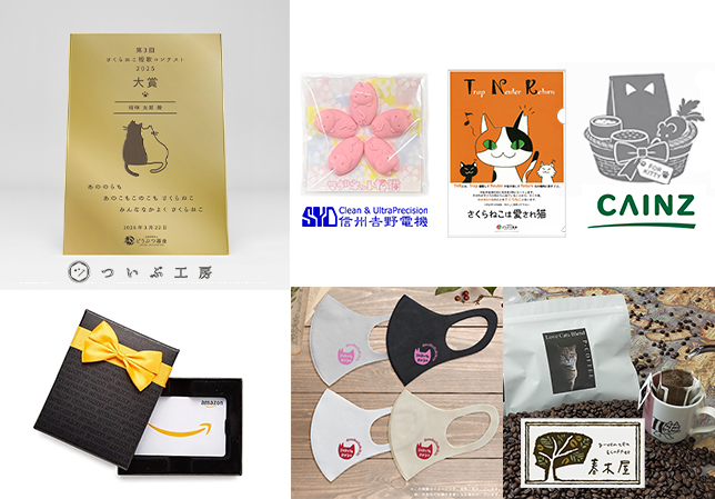 審査員賞および優秀賞にも、支援コーヒーやペット用品、さくらねこ関連グッズなど、複数の協賛企業から提供された賞品が用意されています。賞品内容は賞ごとに異なります。