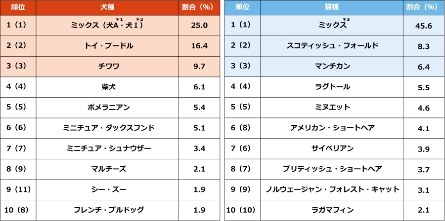 総合ランキングでは、犬・猫ともに「ミックス」が1位を獲得しました。犬種部門では「トイ・プードル」が2位、「チワワ」が3位と続き、「シー・ズー」が2年ぶりにトップ10入りを果たしたほか、「マルチーズ」も順位を上げています。猫種部門では「スコティッシュ・フォールド」が2位、「マンチカン」が3位となり、中位圏ではアメリカン・ショートヘアやサイベリアンの順位が変動しました。