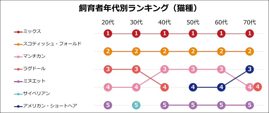 年代別ランキングでは、世代ごとに好まれる犬種・猫種に違いが見られます。犬種では20〜30代で「ポメラニアン」が4位に入り、30代以降では「柴犬」がトップ5にランクインしました。猫種では20〜30代で「ラグドール」が3位となった一方、40〜60代では「マンチカン」が3位、50代以降では「アメリカン・ショートヘア」が上位に入る結果となっています。