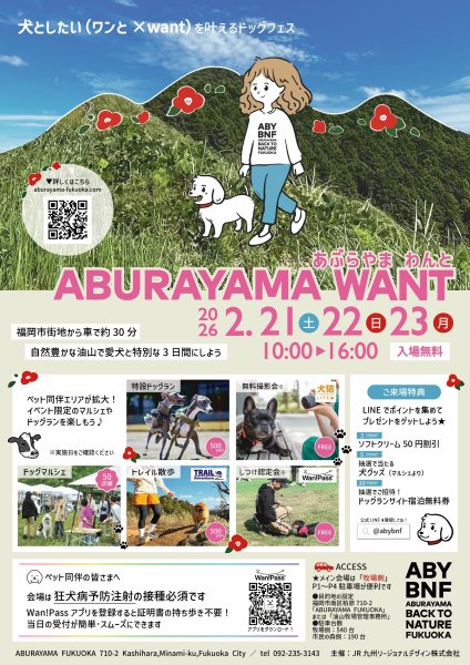 JR九州グループが運営する「ABURAYAMA FUKUOKA」は、ドッグイベント「ABURAYAMA WANT(あぶらやま わんと)」を同施設内の牧場側エリアで2月21日から23日まで開催します。