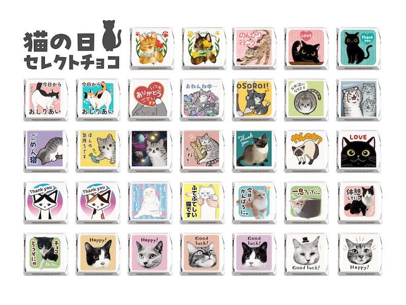 また、写真に重ねるだけでデザインが完成する「オリジナルDECOチョコフレーム」には、愛猫の姿を引き立てる「エンジェルフレーム」などの新デザインが追加に。さらに、同社デザイナーが描き下ろした33種類の猫デザインから1粒単位で購入できる「セレクトチョコ」も発売されます。価格は1粒88円で、味はミルク味です。