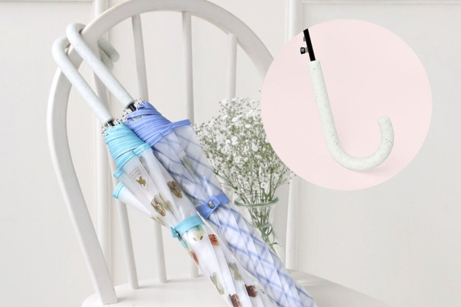 長傘の「クリアアンブレラメゾンテリア」は、荷物が多い時でもボタンひとつで開くジャンプ式を採用。持ち手には色付きの粒が入ったJ字型ハンドルを使用し、実用性とデザイン性を両立させています。