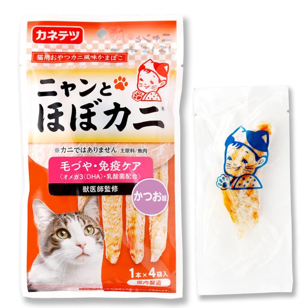 累計販売数量8,000万パックを超えるカニ風味かまぼこ「ほぼカニ(R)」の味や食感、見た目を再現しつつ、猫の健康に配慮した設計がなされています。人の食品と同じ工場・品質基準で製造されるヒュマングレードの品質を実現しており、獣医師による監修も受けています。