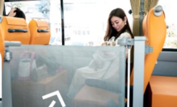 ツアーには添乗員のほかに弊社スタッフ2名が同行し、そのうち1名はドッグトレーナーの資格取得者となっています。移動手段となる「ワンちゃん専用バス」は、通常の約2倍の足元スペースを確保したほか、座席を互い違いに設置して犬同士の視線が合いにくい工夫が施されています。さらに、各座席にはロールスクリーンを設置し、車内には滑りにくい木目調の床や防水・防臭・抗菌仕様のシートを採用しています。