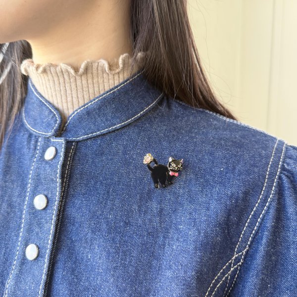 ウィンクする表情やふと振り返ったポーズを表現したネックレス、ピアス、イヤリング、ブレスレットをラインナップ。各アイテムには、三毛猫の尻尾にとまった蝶や、首元の紫のリボンといったブランドを象徴するアクセントが施されており、遊び心のあるデザインが特徴です。