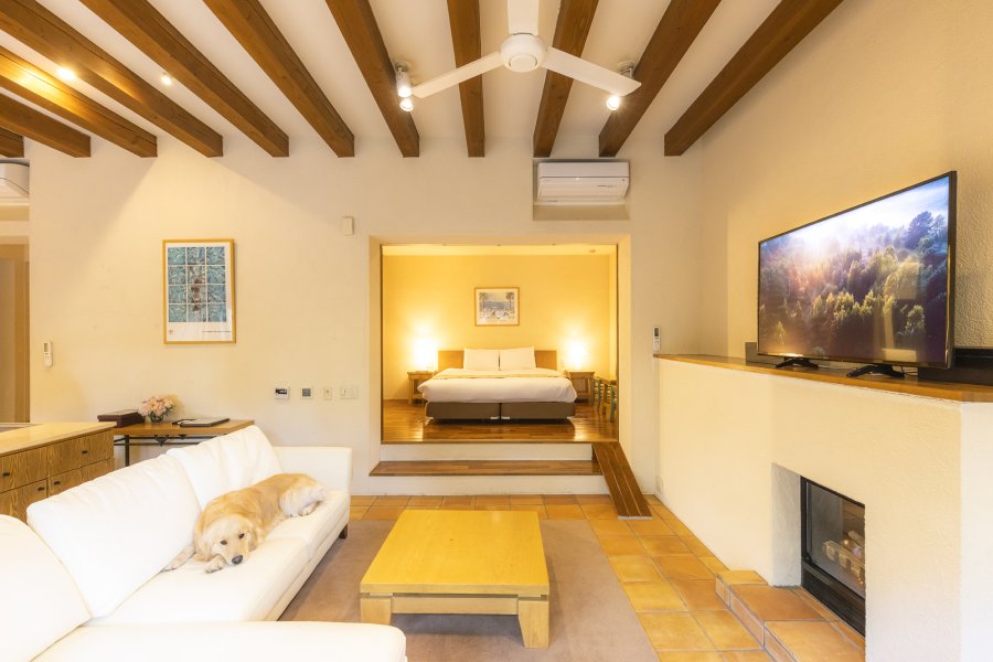 客室は、すべての部屋で60平方メートル以上のゆとりある広さが確保されており、多頭飼いや大型犬との滞在でも快適に過ごせる設計です。室内には愛犬用のケージや木製ベッドが完備されているほか、トイレシートに足洗い用洗面器、バスタオル、お散歩バッグといったドッグアメニティが充実しており、手ぶらでの宿泊にも対応しています。