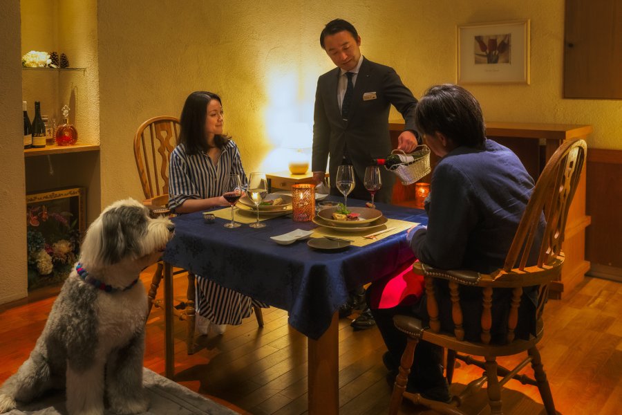 愛犬と一緒に本格的なコース料理を楽しめるダイニング体験も魅力。夕食の鉄板焼きディナーでは愛犬の同伴が可能で、多頭飼いや大型犬同伴の宿泊者には個室の用意も可能です。食事メニューには、愛犬食育士が考案した3種類の専用ごはんが用意されており、山梨県産の鹿やダチョウといった地元の素材を活用したエシカルなメニューが人気を博しています。さらに、記念日向けのサービスとして、米粉を使用したバースデープレートなどの「お祝いプレート」も提供されています。