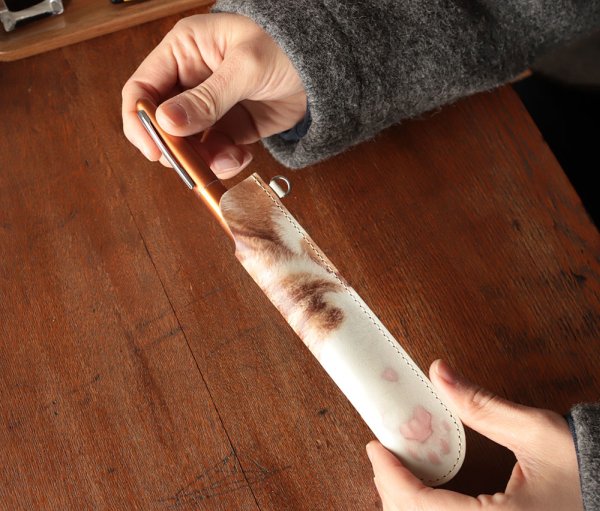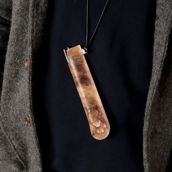 栃木レザーの本革を採用しており、職人が一点ずつハンドメイドで製作。ペンを入れるだけでなく、猫用おやつ「ちゅーる」を1本収納することも可能です。本体には金具が付いており、首から下げたりカバンに取り付けたりして持ち運ぶことができる仕様となっています。