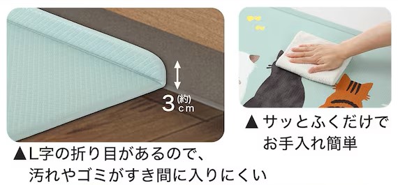 マットの端に設けられた高さ約3cmのL字の折り目が特徴。キッチンマットと床の隙間に食材くずやゴミが入り込むのを防ぎ、お手入れの負担を軽減する構造です。表面が汚れた際も、洗濯の手間なくサッと拭き取るだけで日常のメンテナンスを済ませられる仕様となっています。