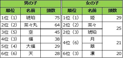 男女別では、男の子部門で「レオ」(253頭)が1位を獲得しました。2位には「ムギ」、3位には「ソラ」が続いています。女の子部門では「ルナ」(286頭)が1位となり、男女別の名前の中で最多頭数を記録しました。漢字の名前ランキングでは、男の子は「琥珀」、女の子は「姫」がそれぞれトップとなっており、自然や縁起を連想させる表記が多く見られました。