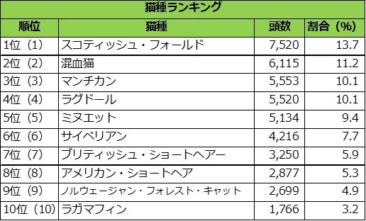 猫種ランキングにおいては、「スコティッシュ・フォールド」(7,520頭、構成比13.7%)が1位を獲得。2位は「混血猫」(6,115頭、11.2%)、3位は「マンチカン」(5,553頭、10.1%)と続き、上位3猫種で全体の約35%を占めています。上位10猫種の顔ぶれや順位は前年と同様の結果となり、安定した人気傾向が示されました。