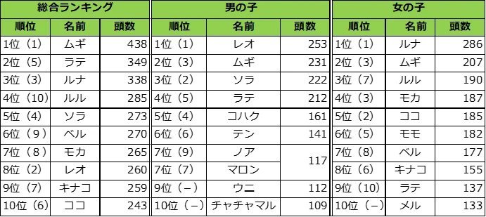 総合名前ランキングでは、「ムギ」(438頭)が1位となり、7年連続でトップを維持しました。2位には前年の5位から上昇した「ラテ」(349頭)、3位には「ルナ」(338頭)が続き、上位3位はいずれも300頭を超える結果となりました。また、前年10位だった「ルル」が4位にランクインするなど、上位陣で順位の変動が見られました。