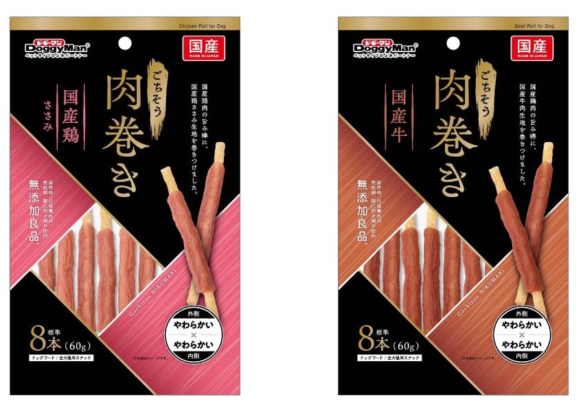 「ごちそう肉巻き」は、保存料、合成着色料、発色剤、酸化防止剤を使用せずに製造されたスナックです。国産鶏肉入りのしなやかな棒を芯に使用し、外側にはお肉の生地を丁寧に巻き付けています。芯の部分には、犬のおなかの健康維持をサポートする食物繊維粒が配合されているのが特徴です。国産鶏ささみを使用した「国産鶏ささみ」と、濃厚な味わいの「国産牛」の2種類を展開しています。内容量はそれぞれ60g(標準8本入り)で、オープン価格です。