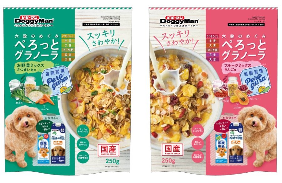 「ぺろっとグラノーラ」は、ヘルシー素材にこだわり、ビタミン・ミネラルを含む六穀を使用したわんちゃん専用のグラノーラです。そのままではサクサクとした食感を楽しめるほか、同社の牛乳をかけたり、ドライフードのトッピングとしても活用できます。キャベツ・にんじん・野沢菜を入れた「野菜ミックス さつまいも味」と、クコの実・パパイヤ・クランベリーを入れた「フルーツミックス りんご味」の2種類です。内容量は250gで、オープン価格です。