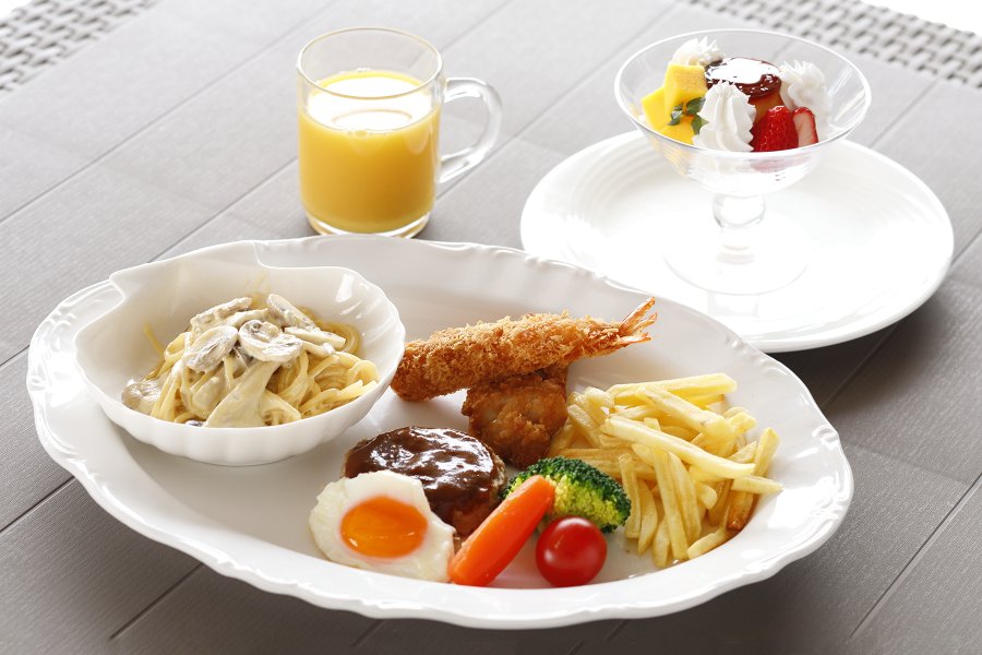 お子さま向けの専用メニューとして、ハンバーグステーキやエビフライ、ホテルシェフ特製のパスタなどを盛り合わせた「お子さまプレート(ワンドリンク付)」も3,500円で用意されています。また、追加料金(3,500円)でアルコールフリーフローの追加も可能となっており、親子三世代での利用にも適した内容となっています。