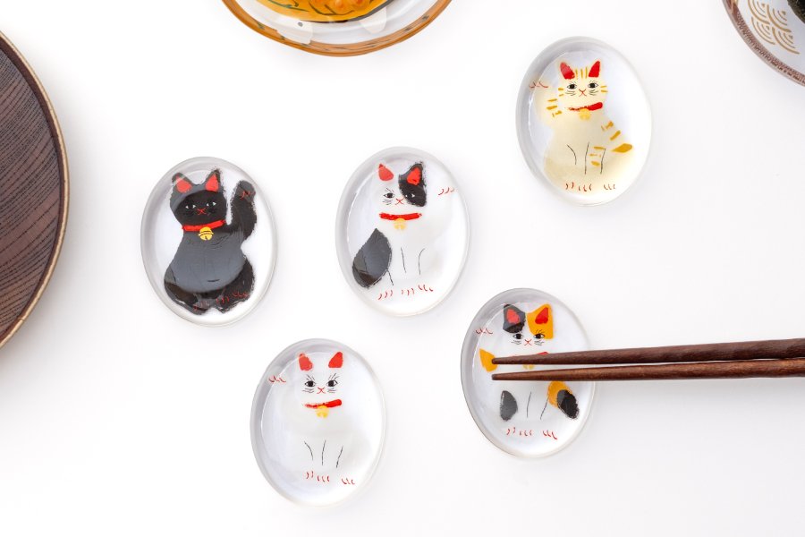 アデリアは、福を招く縁起物を描いたグラスウェアシリーズの新作として「めでたmono招き猫 箸置き」を、公式オンラインストアなどで発売しました。