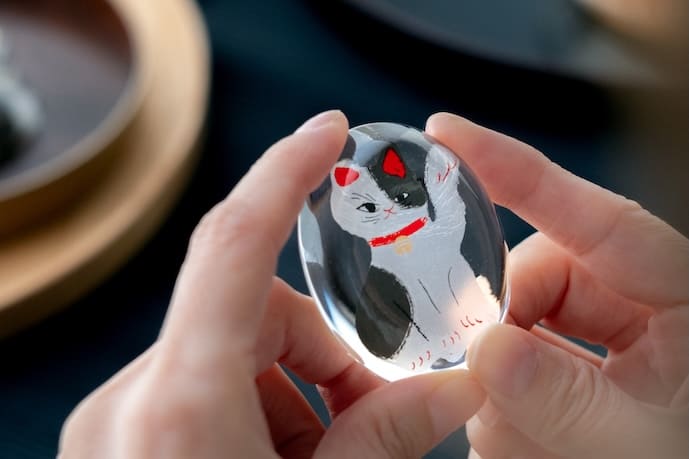 ラインナップは、白、黒、ミケ、ブチ、トラの全5種類です。人気の猫種をモチーフにしており、ガラスの厚みによって模様がふんわりと揺らいで見えるのが特徴です。また、見る角度によって猫の表情が異なって見える視覚的な楽しみも備えています。