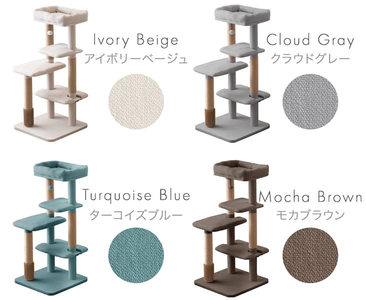 「洗える!カバーリングキャットタワー」は、各段のステップとベッドに着脱式のクッションカバーを採用しており、取り外して洗濯することが可能です。カラーは、クラウドグレー、アイボリーベージュ、モカブラウン、ターコイズブルーの4色が展開されています。高さ120㎝の設計により圧迫感を抑え、子猫やシニア猫でも上り下りしやすくなっています。また、愛猫が体をこすりつけて毛繕いができる「すりすりポール」を設けている点も特徴です。
