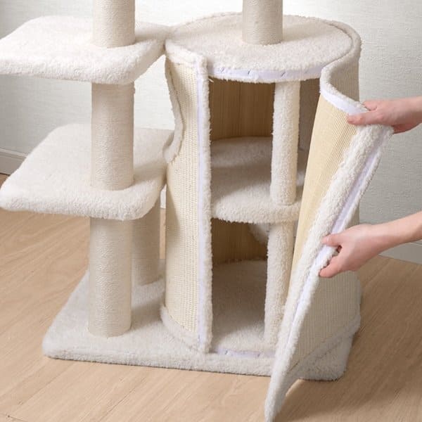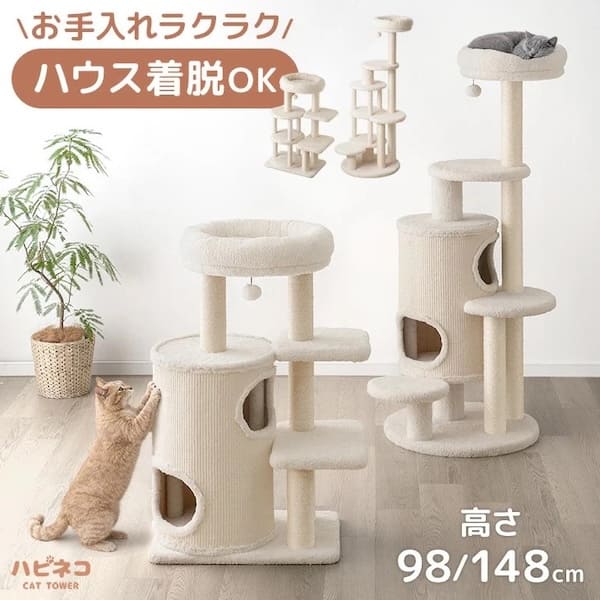 「もこふわワントーンキャットタワー」は、全てのパーツをミルクアイボリーで統一し、マジックテープで取り外し可能なハウスを備えています。ハウス内装には抗菌・防臭効果のある竹素材を使用しており、最上段のベッドも丸洗いが可能です。高さは98㎝と148㎝の2タイプから選択でき、ハウスの外壁でも爪とぎができる設計になっています。