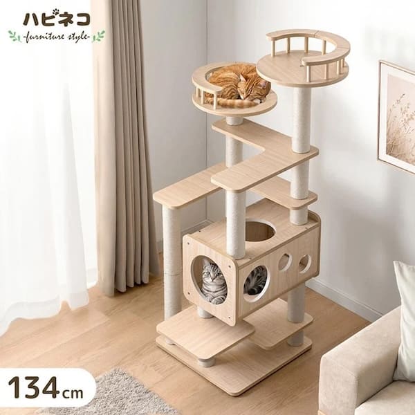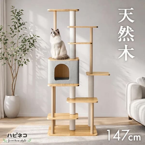 「木目調デザインキャットタワー」は、汚れに強い強化紙化粧繊維板を採用し、食べこぼしなどもサッと拭き取れる仕様です。ステップ間の距離を抑え、最下段には可動式のステップを配置することで、足の短い猫やシニア猫の移動をサポートします。さらに、UV塗装を施した「天然木キャットタワー」は、ささくれやシミを防ぐ耐久性と上質な質感を両立。爪とぎポールには研ぎカスが少なく、においも薄い綿紐が使用されています。