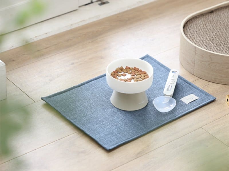 「フードボウル」は、猫の吐き戻しや食べ戻しを防ぐため、高さを11㎝に設計しています。これにより食事がスムーズになり、首や腰への負担も軽減します。デザインはマットな質感の白い皿にグレージュの台座を組み合わせており、リビングにも馴染む仕様です。