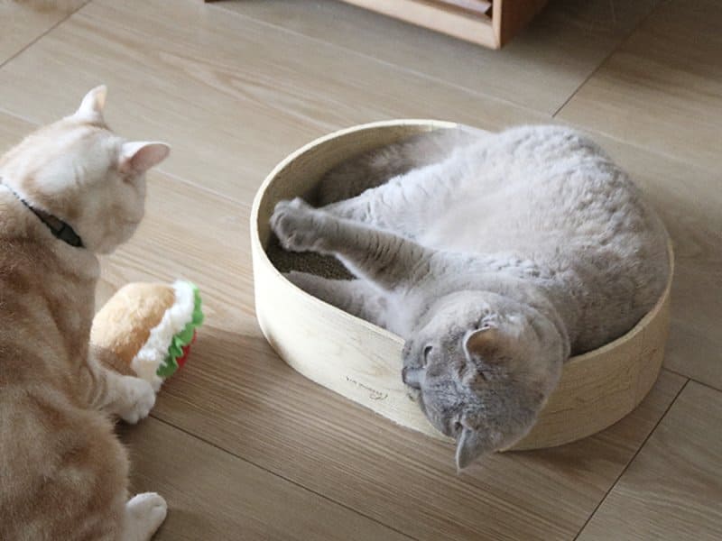 「オーバル 爪とぎ」は、インテリア性を重視し外枠に明るい木目シートを採用しました。高密度な段ボール素材を使用しているため研ぎカスが散らかりにくく、3枚セットの爪とぎ板は両面使用が可能です。